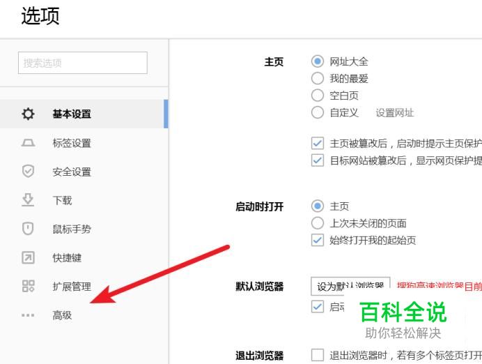 打开选项设置页面后,点击左边的‘高级’