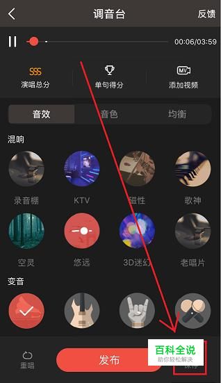 我们在K歌完成后,对音效和音色等进行调整,调整完毕后,点击右下角的“保存”,即可完成对歌曲的保存。