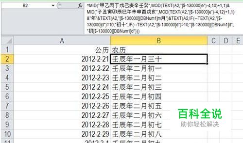 假如把公式改成:=MID("甲乙丙丁戊己庚辛壬癸",MOD(TEXT(A2,"[$-130000]e")-4,10)+1,1)&MID("子丑寅卯辰巳午未申酉戌亥",MOD(TEXT(A2,"[$-130000]e")-4,12)+1,1)&"年"&TEXT(A2,"[$-130000][DBNum1]m月")&TEXT(A2,IF(--TEXT(A2,"[$-130000]d")=10,"初十",IF(--TEXT(A2,"[$-130000]d")>10,"[$-130000][DBNum1]d","初[$-130000][DBNum1]d"))),那就更像农历表示法了,不过因为农历每年开始日期都不一样,所以函数很难达到十分精确的结果,只能是将就着用。 那就更像农历的表示法了。