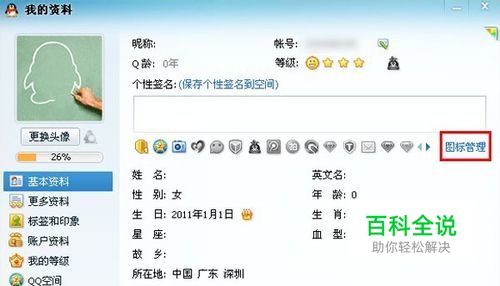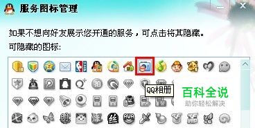 隐藏:可以设置让QQ相册图标不显示,您的相册数据不受影响,也可以正常使用,操作步骤如下: 1、 在QQ客户端,点击“个人头像”进入“我的资料”的窗口; 2、 点击“图标管理”; 3、 点击“QQ相册图标”即可隐藏QQ相册图标。 4、隐藏后效果图(主人状态查看相册图标如下图,则代表已隐藏,好友查看您资料时该图标为灰色未点亮的状态)。