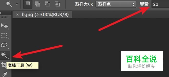 然后左左边的工具栏里选择魔棒工具,并适当把容差设置大一点,设置为22.
