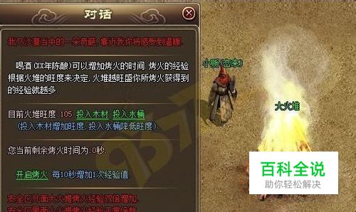 在火堆旁边,双击使用千年陈酿就能获得烤火时间,通常是每瓶千年陈酿获得20分钟烤火时间。在烤火时间结束前,你只要靠近火堆,不用做其他,就能获得大量经验。而对于烤火所获得的经验,大火堆是小火堆的两倍。 因烤火需要燃料,火势也有减小甚至熄灭的时候,当烟火烧到最红最后,烟就会飘走,火就会熄灭……当火势减小时,单位时间内获得的经验也会减少,这时你需要向火堆中投入木材增大火势,以获得更多的经验。木材分为普通木材、高级木材、完美木材、极品木材、珍品木材,不同品质的木材能增加火堆旺度不同。 另外,如果你看不惯别人在火堆旁卿卿我我、亲密无间,也可以搞些小动作当一回消防员:点击火堆,然后选择“投入水桶”,让火势减弱甚至熄灭,让烤火的人再钻木取火去。