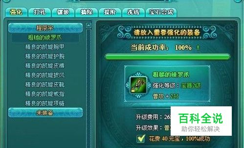 装备强化主要用于提升装备的主属性,例如增加武器的普通攻击,衣服的普通防御等。 装备强化页面中,左侧装备栏分为玩家角色、各个家将和未装备等几项,进行强化时无需卸下装备,直接单击选择对应的装备即可。 装备强化的等级受元神中千锤百炼元神等级的限制,强化的时候需要注意哦。 进行装备强化时,只要对应具体的“当前成功率”及相应的绑银消耗就可进行强化。需要注意的是,强化成功率每半小时就会变化一次哦,可由箭头处了解到具体成功率是上升(↑)还是下降(↓)趋势。
