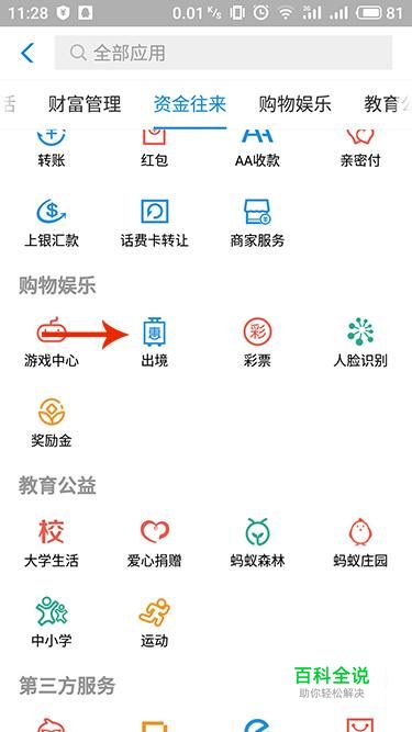 进入全部应用界面,在“购物娱乐”中点击“出境”
