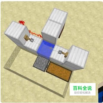 接下来就按照图示的样子铺设好箱子、漏斗和红石,同时在长方形的坑中也放满水。整个装置就制作完成。