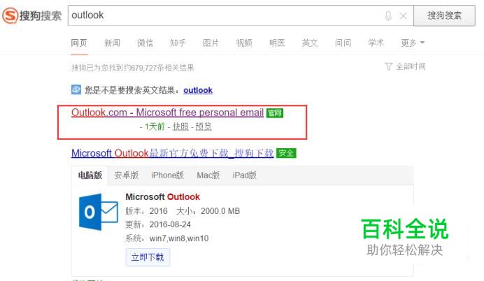 首先,我们使用搜索引擎搜索“outlook”关键字,打开Outlook邮箱网页版站点。
