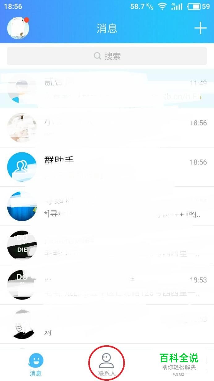 进入QQ主页后,我们看到的是消息界面,在界面中找到“联系人”并点击进入,界面如下图所示。