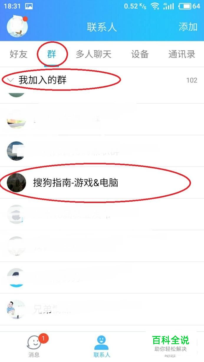 进入联系人页面后,我们看到的界面如下图所示,首先点击“群”按钮,再点击“我加入的群”,在“我加入的群”中找到你想修改备注的群,如下图红色圆圈标记所示。