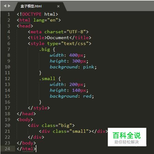 我们通过一个案例来讲解盒子模型,假设有一个宽400px高300px背景颜色是粉色的大盒子,有一个宽200px高140px背景颜色为红色的小盒子,我们在不改变盒子大小的情况下,将小盒子放入大盒子的中心位置,如何实现呢?我们创建一个html页面,在<body>标签中设置一个div,class取值为big,在div中再嵌套一个div,class取值为small。然后我们在<head>标签中添加<style>标签用于设置css的样式,如下图所示,其中.big和.small均为类选择器。