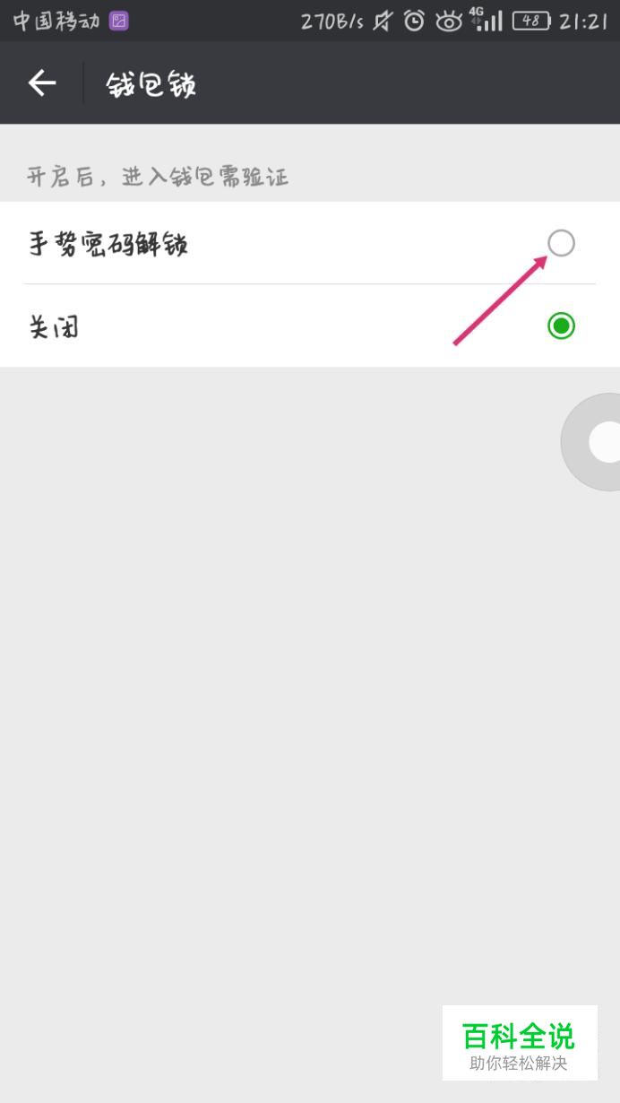 点击“手势密码解锁”,然后需要输入你的支付密码验证你的身份,才能开启钱包锁的手势密码解锁功能。