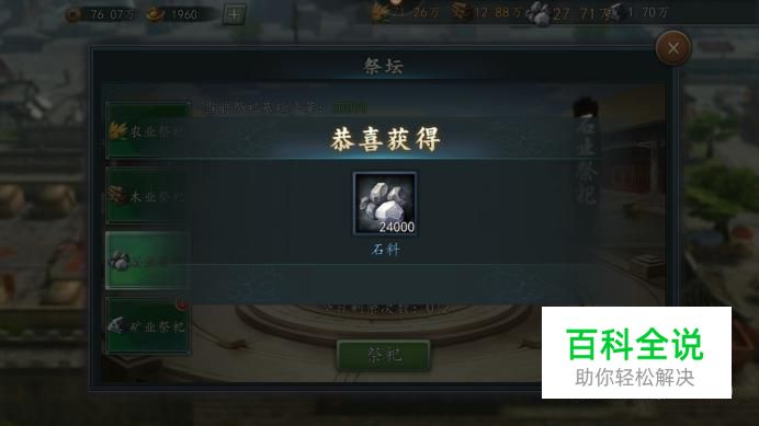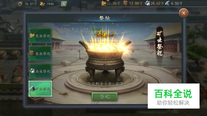 通过祭坛祭祀获得 每天祭坛都会进行一次重置,在祭坛里四种资源都可以获得,每种资源有一次免费祭祀的机会,另外一次需要花费20元宝进行祭祀。通过祭祀可以获得大量的资源,有时可能出现2倍或者3倍暴击,就会在基数资源的基础上乘2或者是乘3,这样的话获得的资源数量就更多了。
