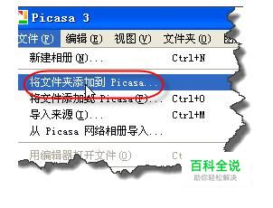 首先启动Picasa软件,依次选择文件,然后选择将添加文件夹到Picasa可以批量将图片添加到软件。