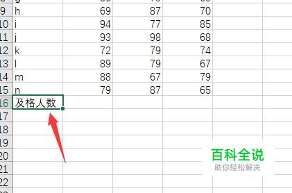 确定及格人数所在的行。因为每个表格的统计情况不同,因此选择一个合适的位置写上几个人数,这样在计算的时候会更加清晰,各科的及格人数情况。