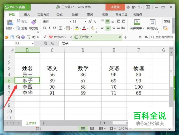 进入表格主界面后,制作一个简单的工作表。我们的目的是将“麻子”的各科成绩按照从低到高的顺序排列出来,如图所示: