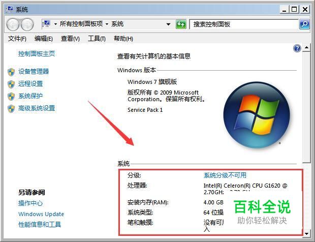 点击属性选项,弹出系统对话框,在该对话框内我们就可以看到我们的电脑的系统配置,如图所示: