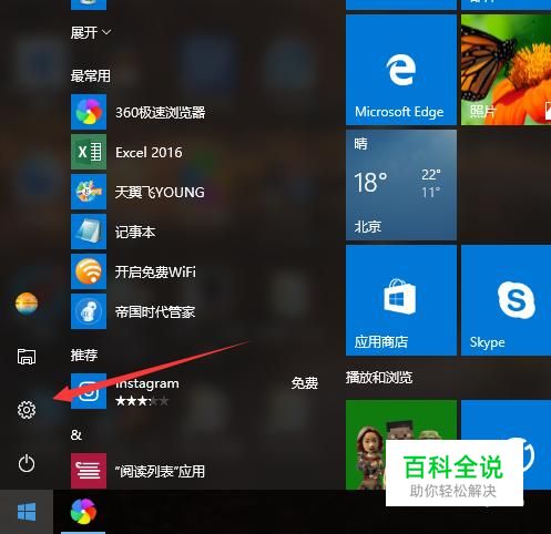 首先点击电脑桌面左下角的开始按钮,然后选择设置。