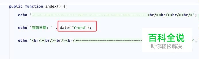先看下我们的代码,如图,在php里要获取到当前日期,我们可以用date函数,函数的第一个参数就是格式化字符串,第二个参数是时间戳,这个参数可以不输入,默认就是当前日期。 代码: date('Y-m-d') // 这里的Y就是代表年,m代表月,d代表日。