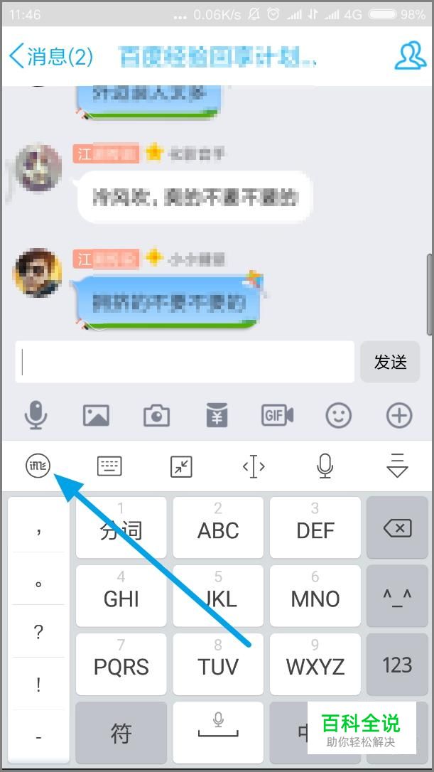 首先我们在聊天界面,打开讯飞输入法,点击左侧的讯飞图标!