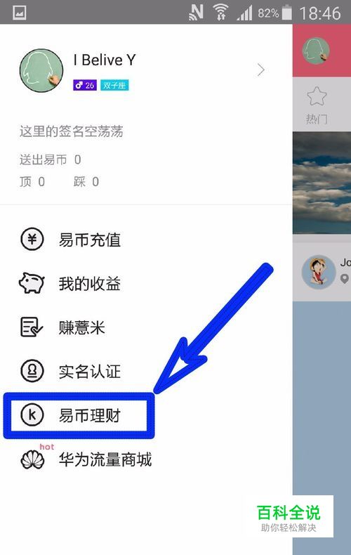 打开易直播APP,点击左上角头像弹出个人中心菜单,选择"易币理财 "。