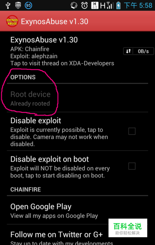 在手机桌面上打Exynos,会跳出来一个窗口,直接点击确定,在程序菜单里面找到OPTIONS这一项,点击ROOT device这项,点击后悔提示你成功获取了最高管理权限,成功获取权限之后,这一项也变成不能点击的灰色项