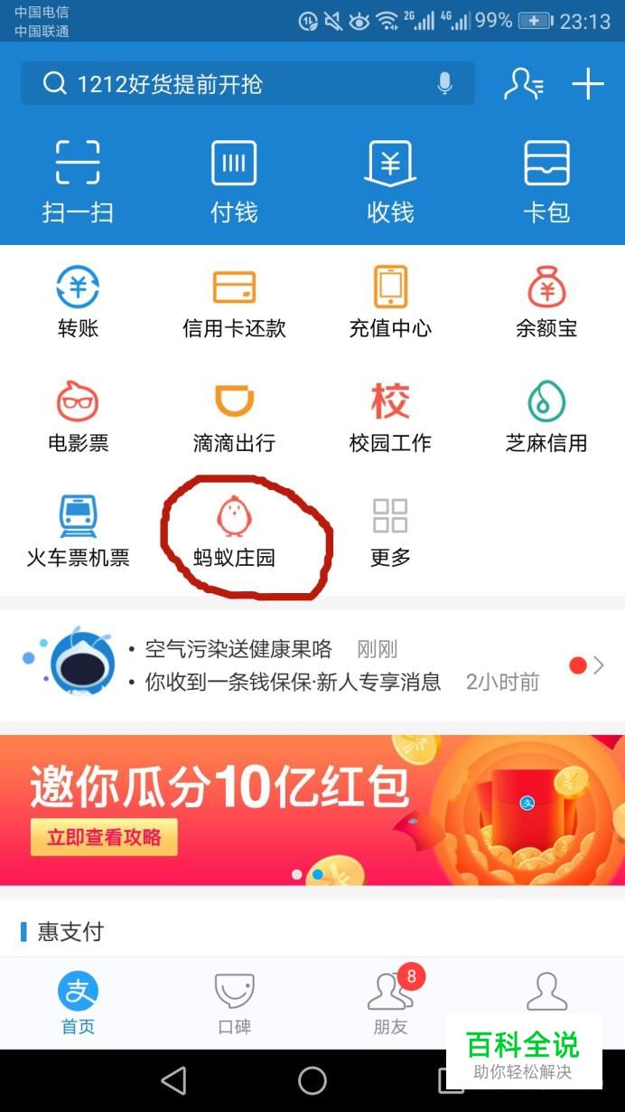 打开支付宝,由于喵嗷最近比较喜欢玩蚂蚁庄园,因此把蚂蚁庄园放到了首页,如果没有放到首页朋友可以在更多里面找到。点击“蚂蚁庄园”。