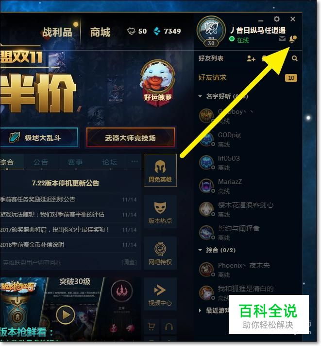 进入到英雄联盟的游戏客户端之后,我们点击右上角的小铃铛。