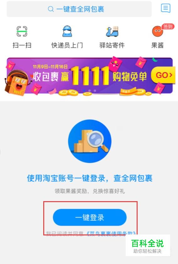 打开菜鸟包裹App,进入菜鸟包裹主页,点击“一键登录”,绑定您的手机号码,管理更多包裹。