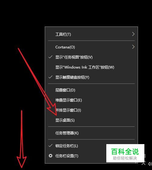 鼠标右击屏幕底部的任务栏,一定要选择底部的任务栏,然后找到显示桌面即可