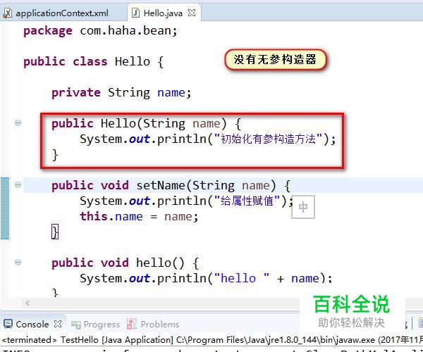 上述步骤是通过属性注入依赖的方式,下面我们讲解通过构造器注入依赖的方式。通过构造方法来注入bean的属性值或依赖对象,它保证了Bean实例在实例化后就可以使用 。构造器注入在<constructor-arg>元素里声明属性,没有name属性,按照构造方法默认的顺序或指定顺序来注入。如下图所示,可以看到属性注入的顺序完全和构造方法传参的顺序一致。