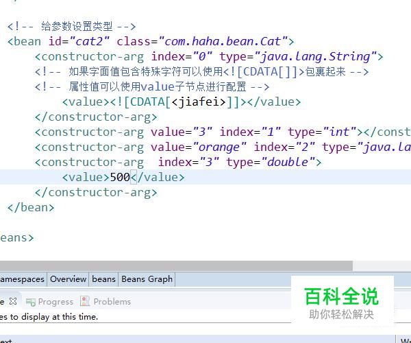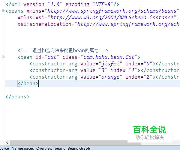 使用构造器注入属性值可以指定参数的位置和参数的类型,用以区分重载的构造器。上述步骤指定了参数的位置,下面我们再为Cat方法创建一个有参构造,传入4个参数,如下图所示,而相应的bean的配置增加了type属性,用于标识字段的类型。
