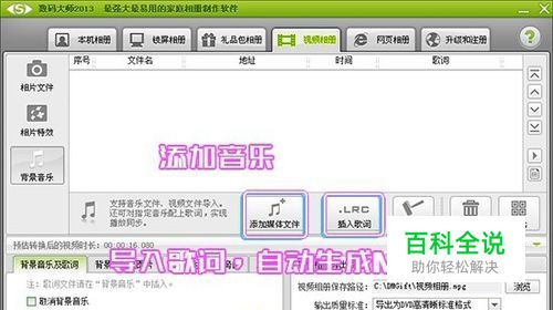 第三步:为音乐相册加上音乐 点击“添加媒体文件”按钮就可以导入音乐文件。网上搜索下载文件就可以。通过“插入歌词”功能导入和音乐相匹配的LRC歌词文件,歌词字幕就自动生成了。