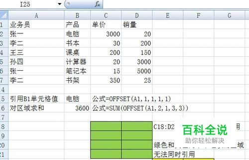 作为偏移量参照系的引用区域。Reference 必须为对单元格或相连单元格区域的引用;否则,函数 OFFSET 返回错误值 #VALUE! 也就是说Reference可以对单一单元格,或一个整体的区域引用,而不能是一些不连续的区域。如图示