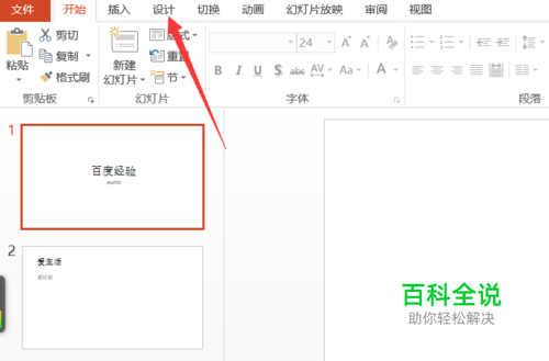 首先我们先打开一个ppt文档,打开之后我们会发现如图1所示,此时的幻灯片编号的顺序就是从1开始的,我们要更改的话,那么单击菜单栏上方的“设计”按钮。