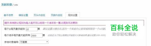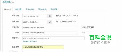 进入后台,点击投票管理->发起投票 这里面有四个选项卡,依次是基础信息,模板选择,页头和页尾内容区,最后是投票规则。只需要填写简单开始日期,结束日期,标题等。其他可以直接默认不需要改动,然后就创建了一个投票活动。