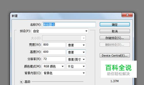 首先启动Photoshop cs5,执行文件-新建命令,新建一个大小为800*600,分辨率为72,背景颜色为白色的文档。