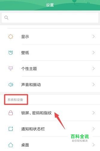 在设置中找到系统和设备分类。此分类中有屏锁、密码和指纹,点击此选项。
