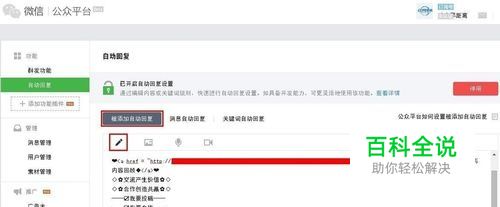 ❤被添加自动回复❤选择“自动回复”—“被添加自动回复”,点击文字方式(有文字、图片、声音、视频四种回复类型)输入相关内容。这里“精彩内容回顾”就是指向您公众号历史消息的地址。格式为:<a href = "http://URL">◆精彩内容回顾◆</a>