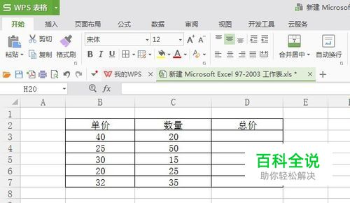在打开的电子表格简单的输入如下单价和数量,作一个简单的表格。右侧的总价是我们需要自动计算的单元格。