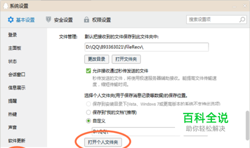 打开QQ,点开系统设置(QQ面板最下方一栏的“小齿轮”形状或者上方右键单击自己的头像) 点击右侧的文件管理--->打开个人文件夹