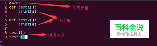 全局变量 如果一个变量,既能在一个函数中使用,也能在其他的函数中使用,这样的变量就是全局变量 1 a=200 2 def test1(): 3 print(a) 4 5 def test2(): 6 print(a) 7 8 test1() 9 test2()