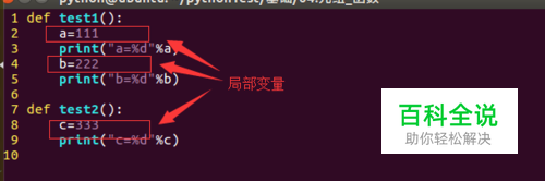 局部变量: 局部变量,就是在函数内部定义的变量 不同的函数,可以定义相同的名字的局部变量,但是各用个的不会产生影响 局部变量的作用,为了临时保存数据需要在函数中定义变量来进行存储,这就是它的作用 1 def test1(): 2 a=111 3 print("a=%d"%a) 4 b=222 5 print("b=%d"%b) 6 7 def test2(): 8 c=333 9 print("c=%d"%c)