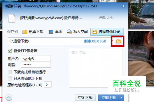 然后再登录迅雷的网页,找到我们要下载的电影及电影地址,点击下载(小编之前文章有介绍如何用迅雷下载电影,小编在这里就不再重复介绍了,给自己电脑安装迅雷即可),我们在新建任务中找到下载地址的文件夹图标,点击
