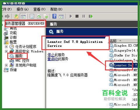 上一步做完,就打开服务器;通过”计算机(或我的电脑)“进入“管理”找到“Lonntec Suf 7.0 Application Service”的服务