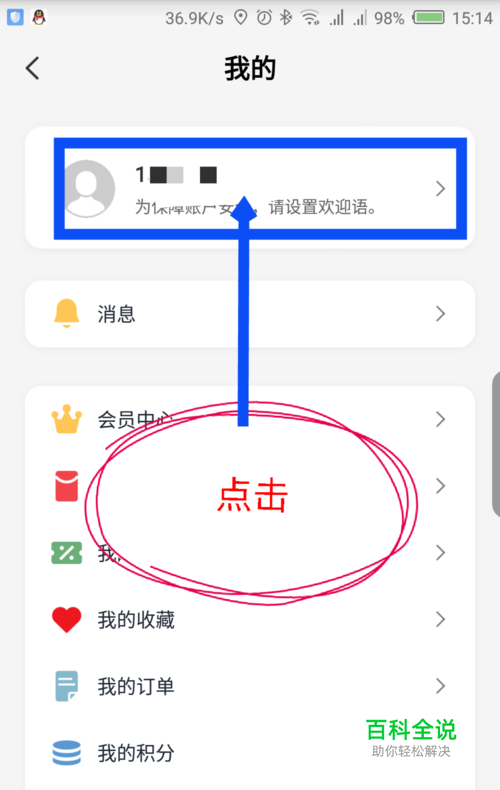 点击后,打开我的界面。在我的界面,点击最上面的显示的手机号选项。如图所示