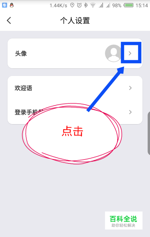 点击手机号后,打开个人设置界面,第一个选项就是头像设置,点击头像后面的箭头选项。如图所示