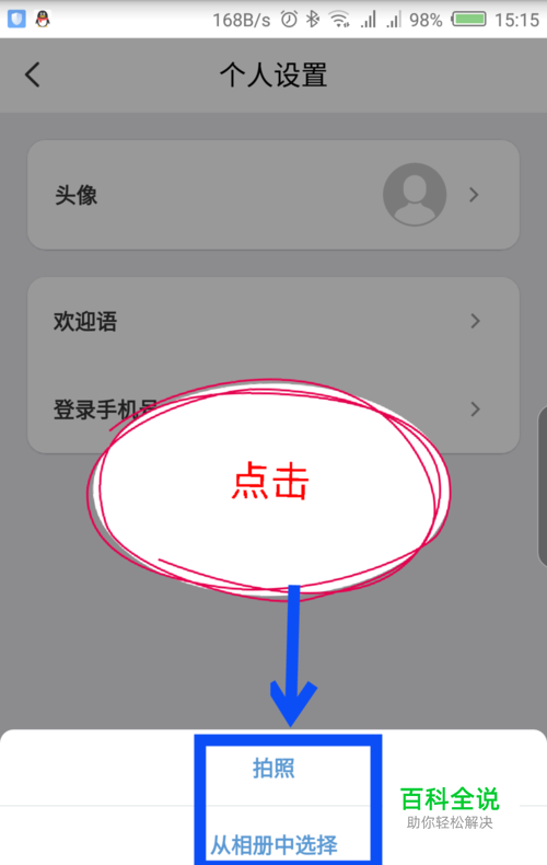 个人设置界面的底部,会弹出一个个窗口,选择拍照或者从相册中选择一个图片,设置为头像。如图所示