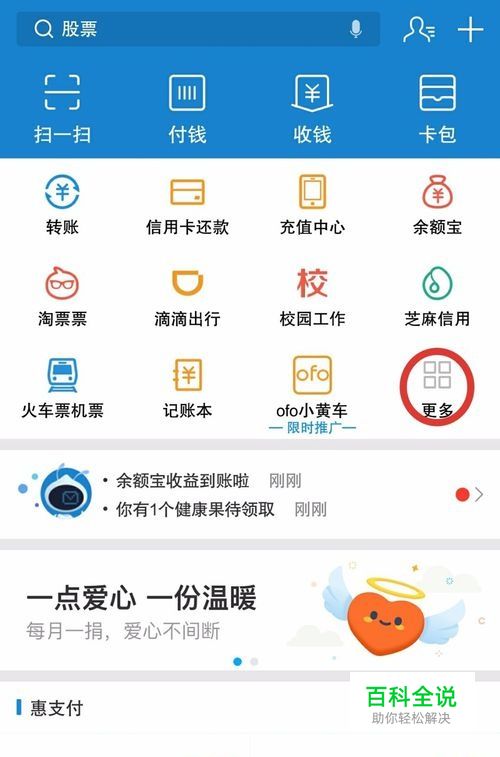 首先打开支付宝找到红圈圈住的【更多】。
