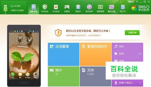 打开360手机助手,首次连接时会安装相应的USB驱动 在界面右侧显示了照片、短信、联系人等信息