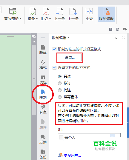 点击【限制编辑】后,在wps右侧会出现一个如下图所示的限制编辑的设置。这里既可以设置限制所有人编辑也可以限制部分,也可以限制局部区域编辑,不一定非要全文本限制编辑。