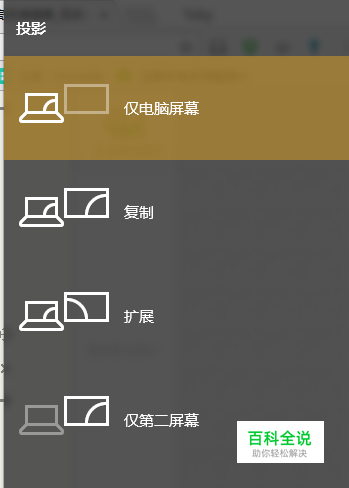 默认是仅电脑屏幕,也就是只在电脑上显示。选择复制,则是电脑和屏幕上显示一样的内容。选择扩展,则是显示电脑的桌面而不显示打开的窗口。选择仅第二屏幕则是只在屏幕上显示而不在电脑上显示。